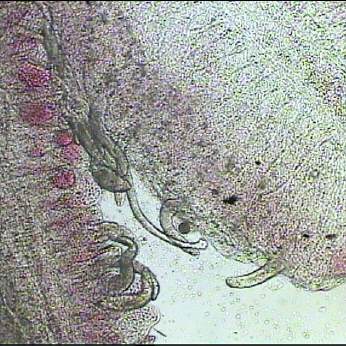 Bereits bei einer 50 fachen Vergrößerung lassen sich die Kiemenwürmer gut erkennen. Charakteristisch sind die 4 dunklen "Augenflecken".
